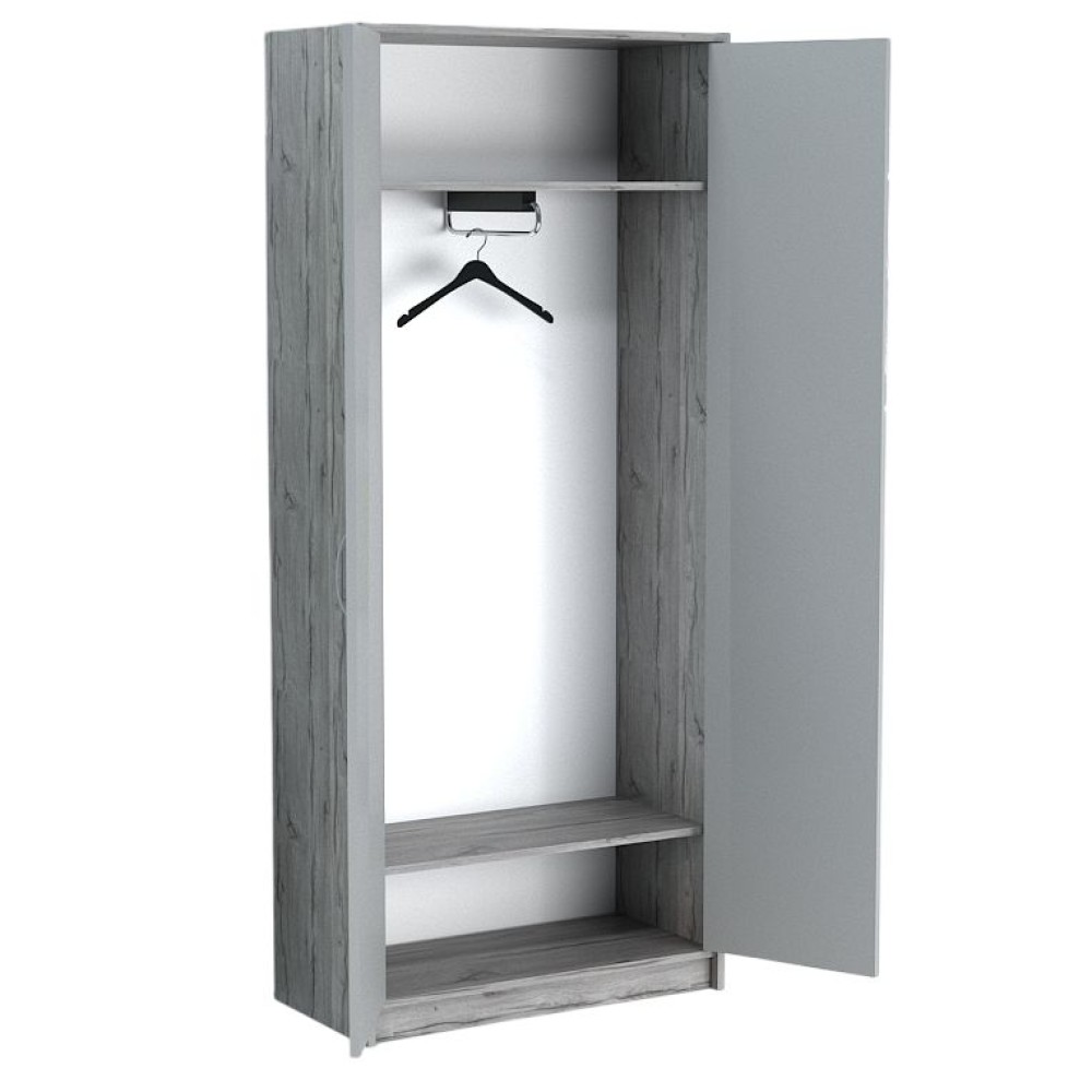 Усередині шафа оснащена відділенням із штангою для вішаків, що ідеально підходить для розміщення верхнього одягу, сорочок або суконь без заломів. Додаткові полиці зверху та знизу забезпечують зручне місце для коробок, складеного одягу чи аксесуарів.