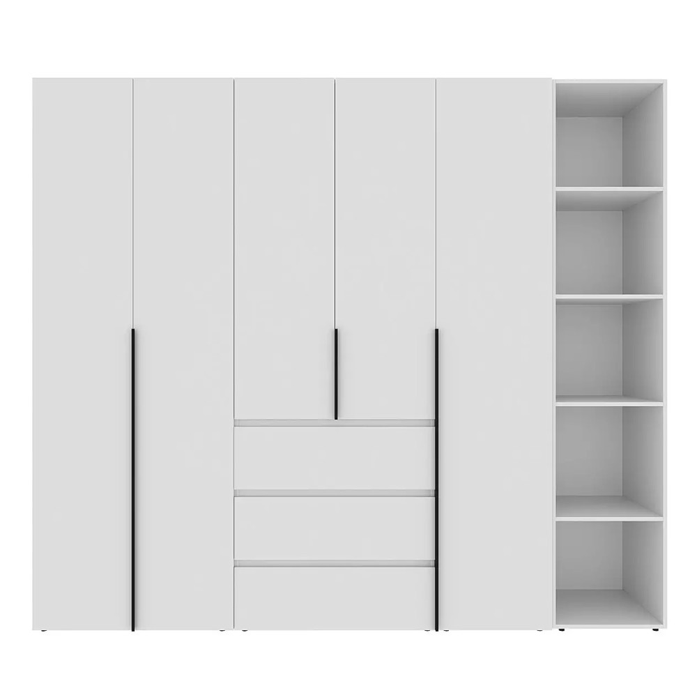 Внутрішня частина шафи поєднує функціональність і комфорт у використанні. Дві металеві штанги дозволяють розмістити одяг на вішалках, підтримуючи його в охайному стані, а кілька полиць забезпечують додатковий простір для зберігання складених речей або аксесуарів. Три висувні ящики допомагають зручно організувати дрібні речі, білизну або документи. Збоку розташований практичний стелаж, який можна використовувати як для коробок і текстилю, так і для декору.