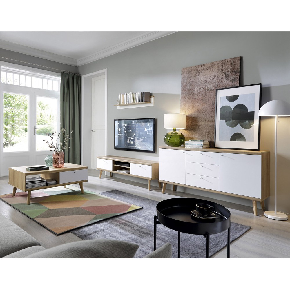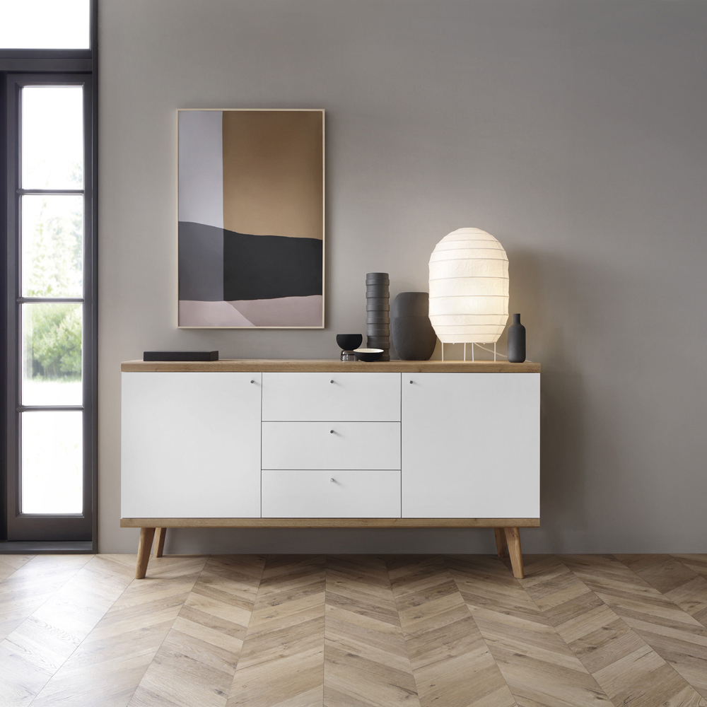 Приглушені кольори, поєднання білого і дерева, а також проста форма роблять його ідеальним для оформлення інтер'єрів у скандинавському стилі і не тільки. На поверхні комода знаходиться простір, який ви можете використовувати для розміщення прикрас, фоторамок, квітів або інших декоративних аксесуарів.