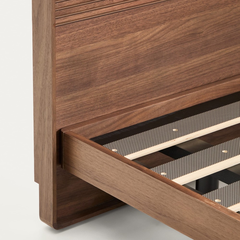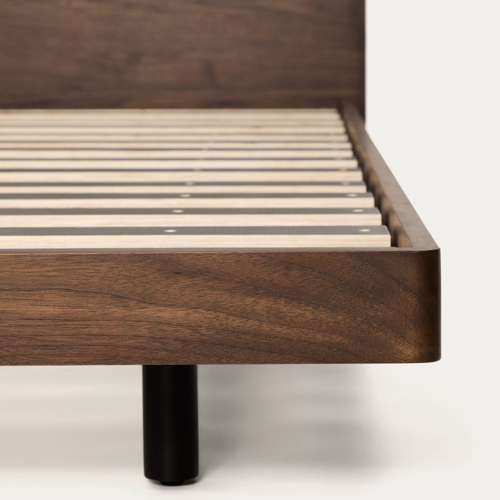 Каркас ліжка оснащений основою з ламелями з березової фанери, що забезпечують оптимальну підтримку матраца і його природну вентиляцію. 9 ніжок з масиву берези з круглим перетином і обробкою з горіхового шпону гарантують стійкість, довговічність і візуальну легкість конструкції.