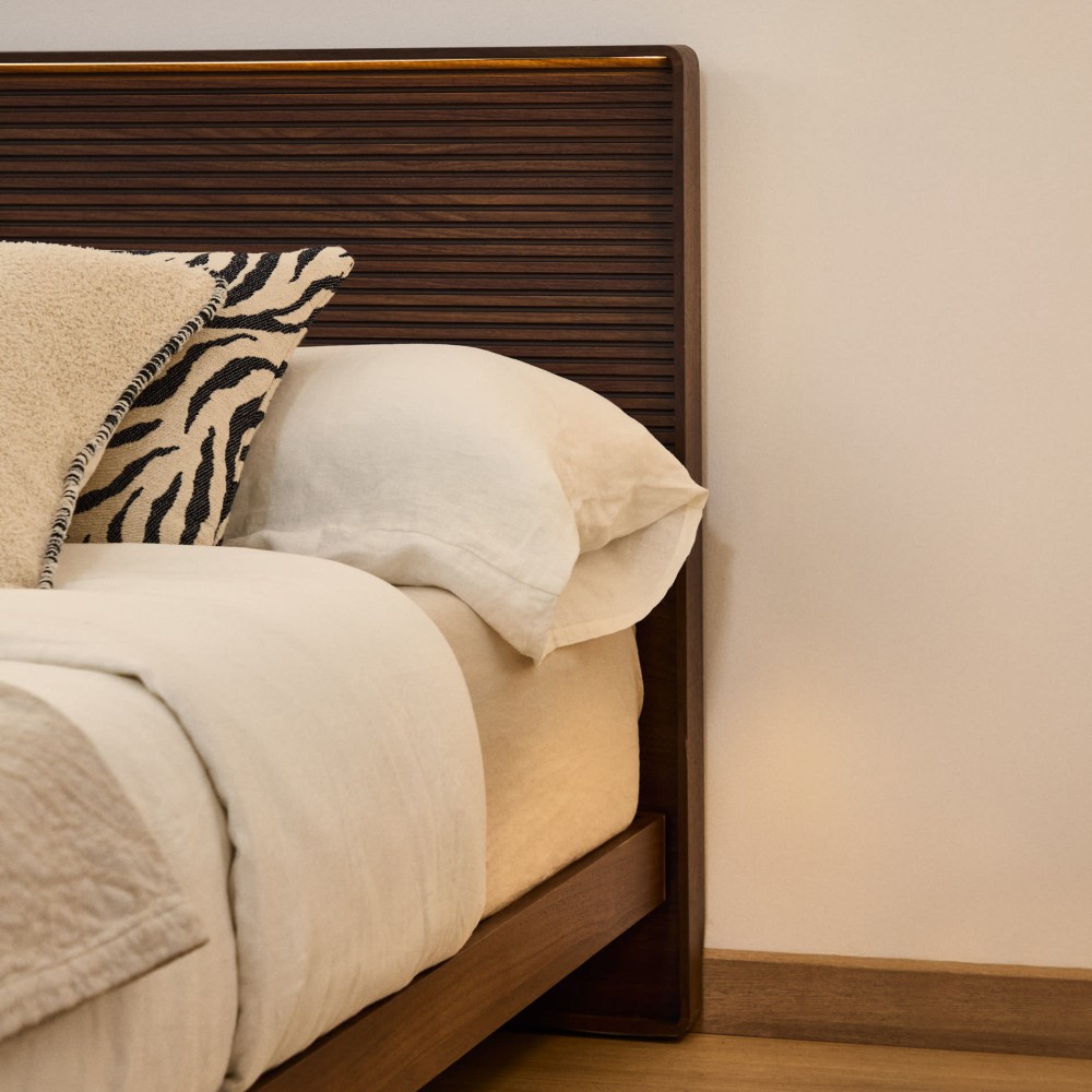 Узголів'я виконано з горіхового шпону з тонким горизонтальним лінійним фрезеруванням, що надає глибину і виразність дизайну. Вбудована світлодіодна стрічка у верхній частині наповнює простір м'яким світлом 3000K, створюючи затишну і розслаблюючу атмосферу для відпочинку і читання.