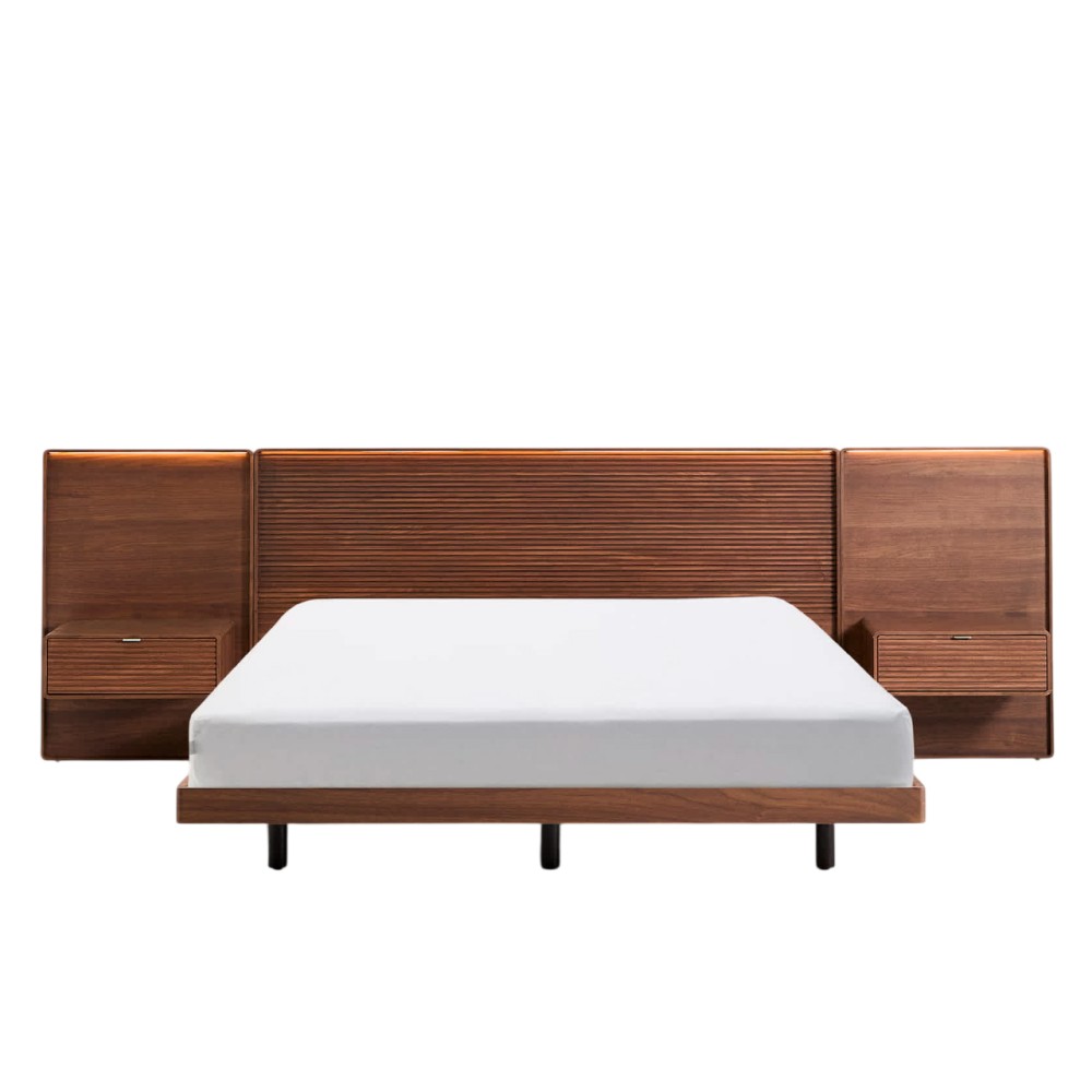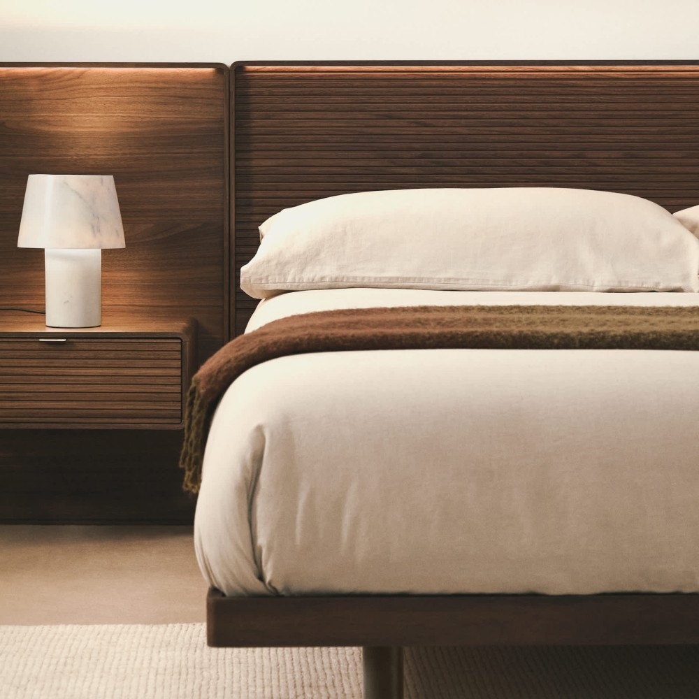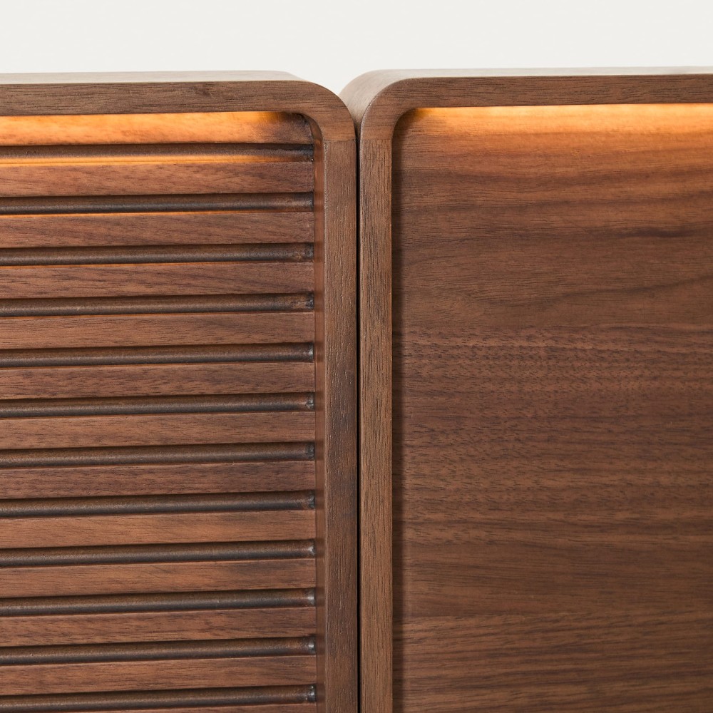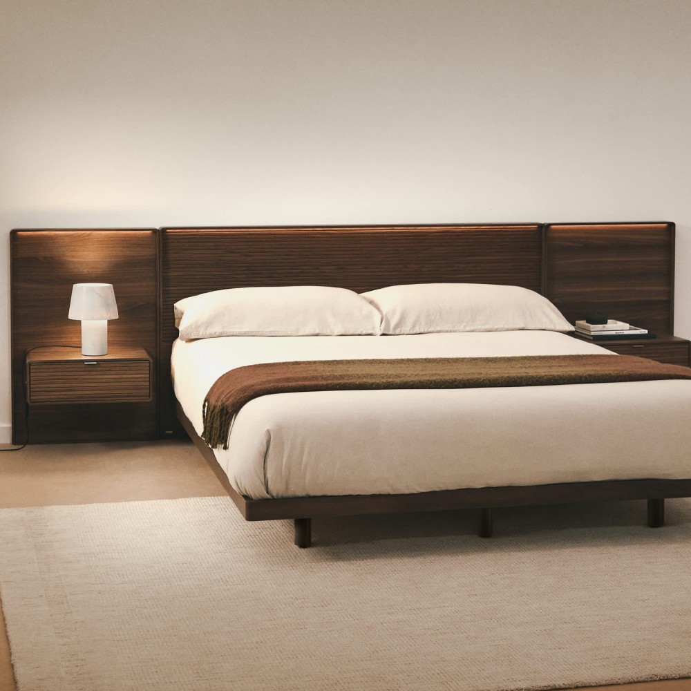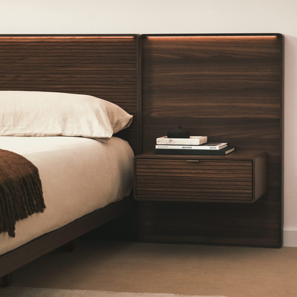 Узголів'я ліжка виконано з горіхового шпону з тонким горизонтальним лінійним фрезеруванням, що додає глибини і характеру. Вбудоване світлодіодне підсвічування 3000K створює тепле і приємне освітлення з м'яким жовтуватим відтінком. Управління підсвічуванням здійснюється пультом ДУ, кабель довжиною 1,5 м дозволяє зручне підключення до мережі.