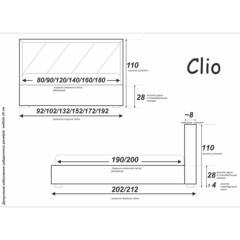 Кліо - комфортне двоспальне ліжко в лаконічному та сучасному дизайні, яке стане вдалим доповненням кожної спальні. Головна фішка - це висока і м'яка голова з незвичайним геометричним малюнком, що робить модель стильним доповненням будь-якого інтер'єру. Модель відрізняється надійністю та зносостійкістю, так як для її виробництва використовуються матеріали високої якості. Каркас виконаний з масиву ясена та березової фанери. Як основа виступають ламелі, що підсилюють ефект ортопедичного матраца і забезпечують циркуляцію повітря. Оббивка виконується з тканини або велюру, вона представлена на вибір у широкій палітрі кольорів. Ліжко може виконуватися з підйомним механізмом, що дозволяє отримати простору нішу для зберігання під матрацом.