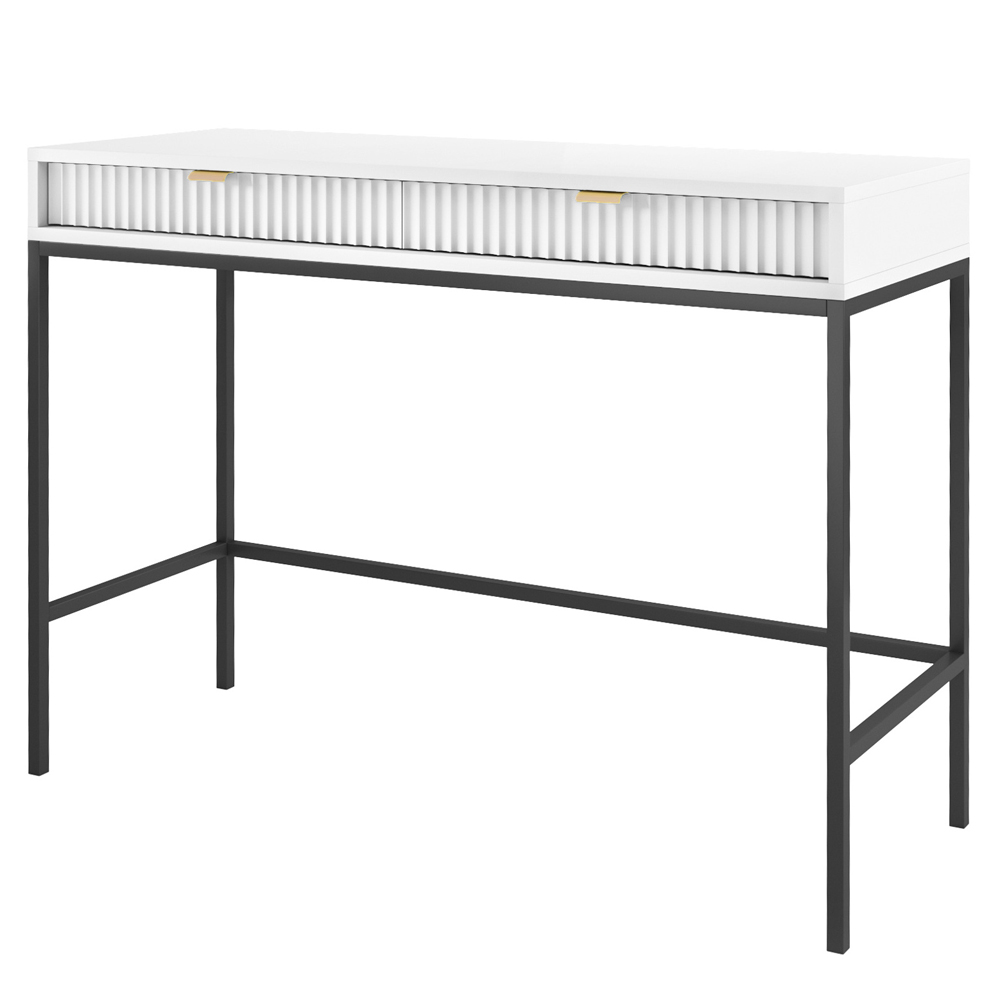 Туалетний столик Nova T104 має рифлені фасади, які візуально додають виробу об'ємності. Мінімалістичні золоті ручки є елегантною особливістю даного столика. Два висувні ящики створені для зберігання необхідних речей.