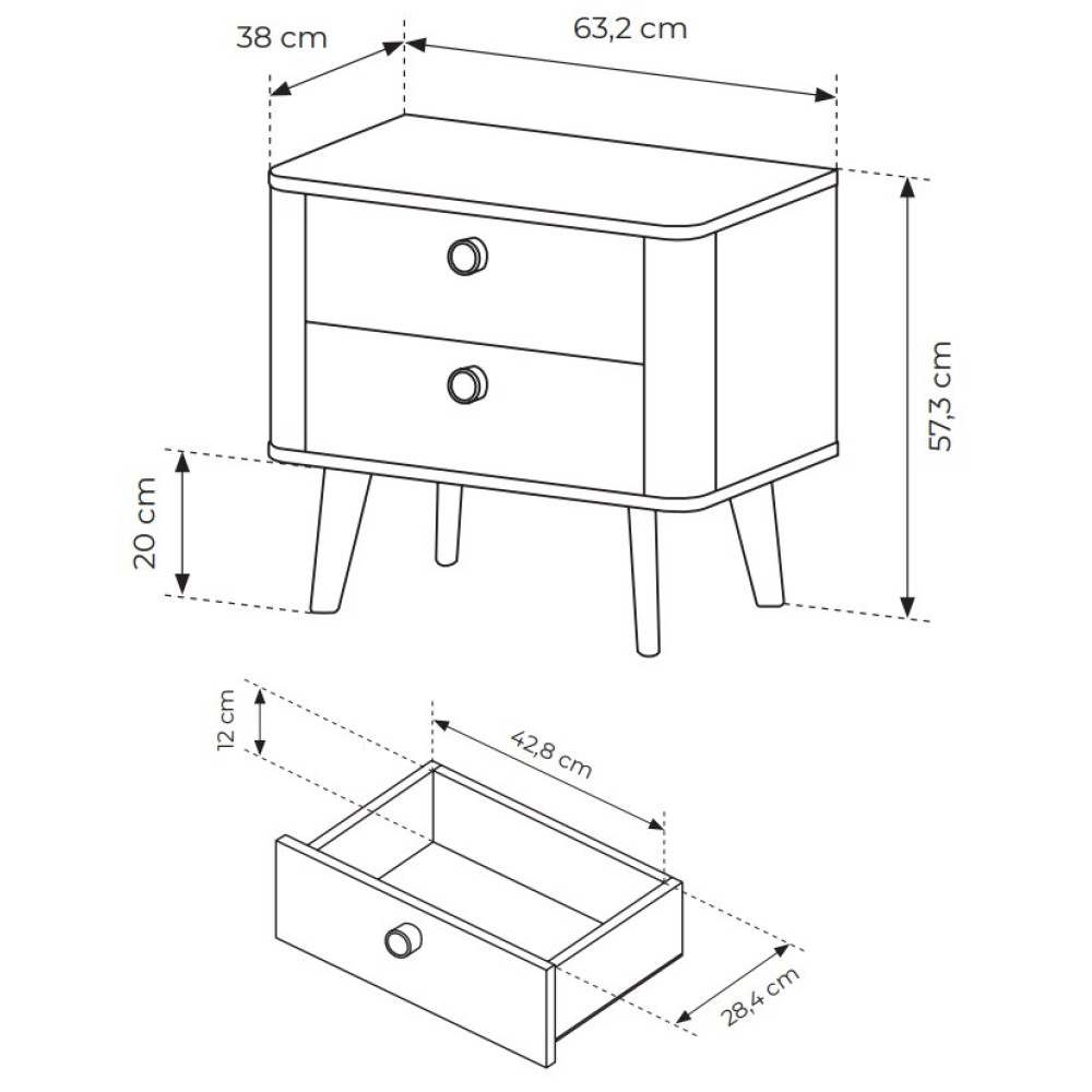 Модель оснащена двома місткими висувними ящиками. Кожна секція встановлена на кулькових направляючих, що забезпечують плавне, тихе і довговічне відкривання. Тумбочка ідеально підходить для зберігання книг, аксесуарів, дрібниць або зарядних пристроїв — все важливе завжди буде під рукою.