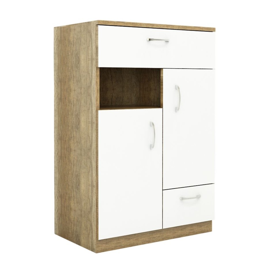 У верхній частині розташована містка шухляда для щоденних дрібниць. Посередині — відкрита ніша, де зручно зберігати речі, до яких потрібен швидкий доступ. Нижче — два окремі відділення за дверцятами та ще одна нижня шухляда, що дозволяє раціонально розподілити простір для різних типів речей.