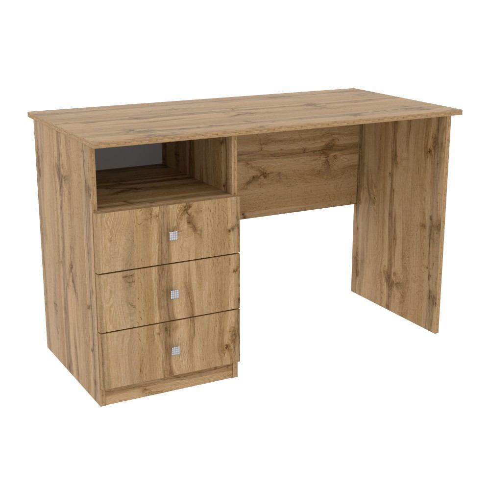 Конструкція столу розроблена з урахуванням потреби у швидкому доступі до канцелярії та підручників. З лівого боку розташована містка тумба, що включає три висувні шухляди. Використання сучасних телескопічних направляючих гарантує їхнє плавне та безшумне відкриття. Над шухлядами розміщена зручна відкрита ніша, яка ідеально підходить для речей, що мають бути завжди під рукою, наприклад, зошитів або щоденника.