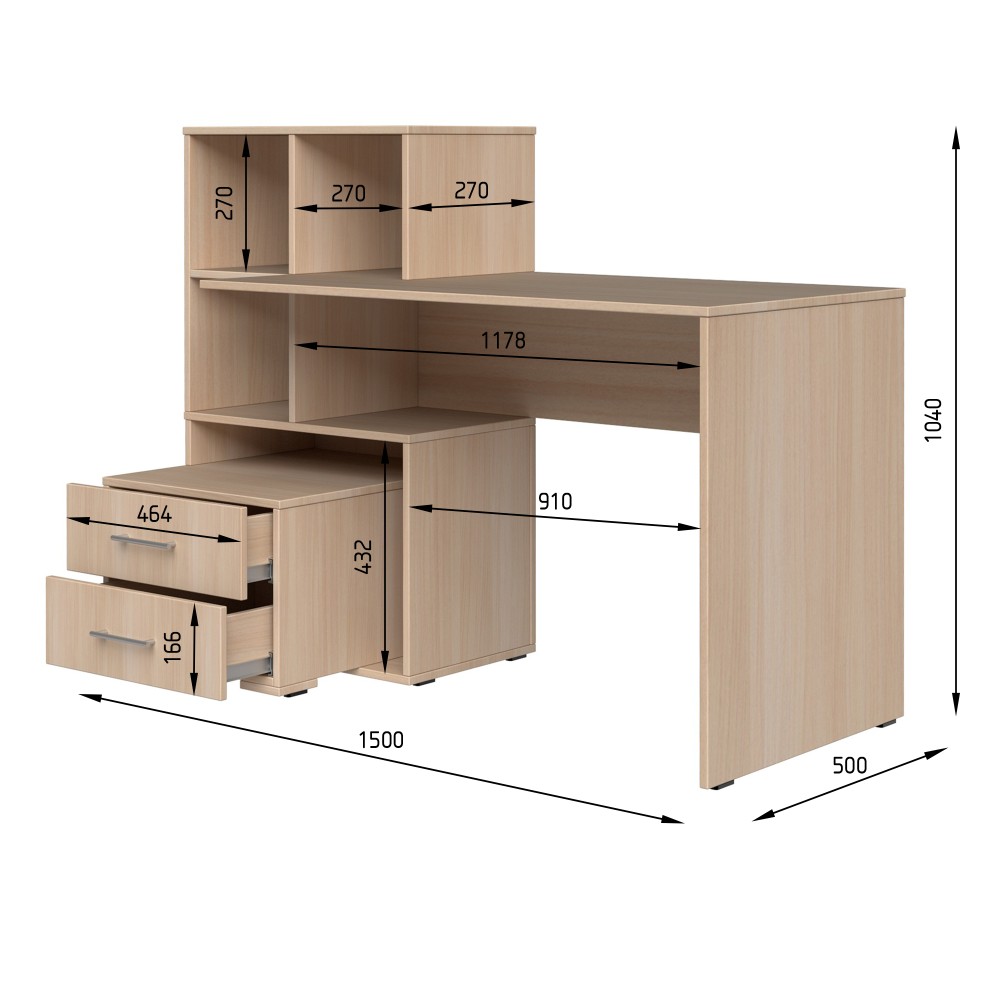 Висувні ящики допоможуть підтримувати порядок, ховаючи дрібні речі, а відкриті полиці забезпечують легкий доступ до найнеобхіднішого. Така комбінація робить стіл практичним рішенням для тих, хто цінує комфорт і системність у роботі чи навчанні.
