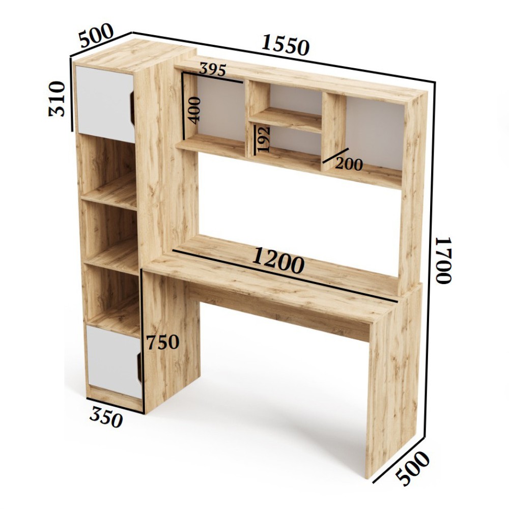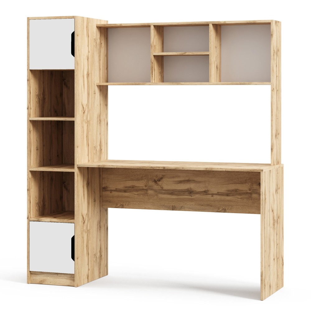 Широка стільниця забезпечує достатньо місця для ноутбука, лампи та всіх необхідних речей. Верхні відкриті полиці додають організації, дозволяючи мати усе під рукою, не перевантажуючи простір.