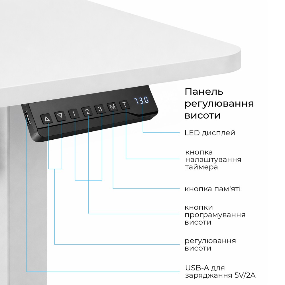 Зручна панель керування робить налаштування висоти простим і швидким. Програмовані кнопки пам’яті дозволяють зберегти улюблені положення столу та миттєво перемикатися між ними без додаткових налаштувань.