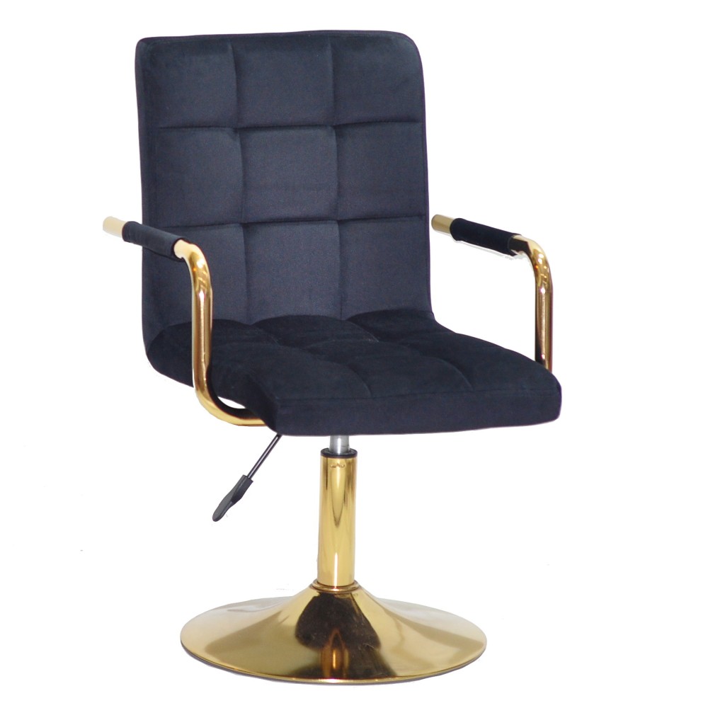 Стильний та функціональний стілець Tower arm lift gold ідеально підходить для сучасних кухонь та кав'ярень. Виріб встановлений на міцному металевому млинці та має каркас із сталі золотого кольору. Регулювання висоти здійснюється за допомогою механізму газліфт, а підлокітники забезпечують зручність при використанні. Оббивка сидіння та спинки може бути виконана з екошкіри або оксамиту, залежно від вибраного кольору.