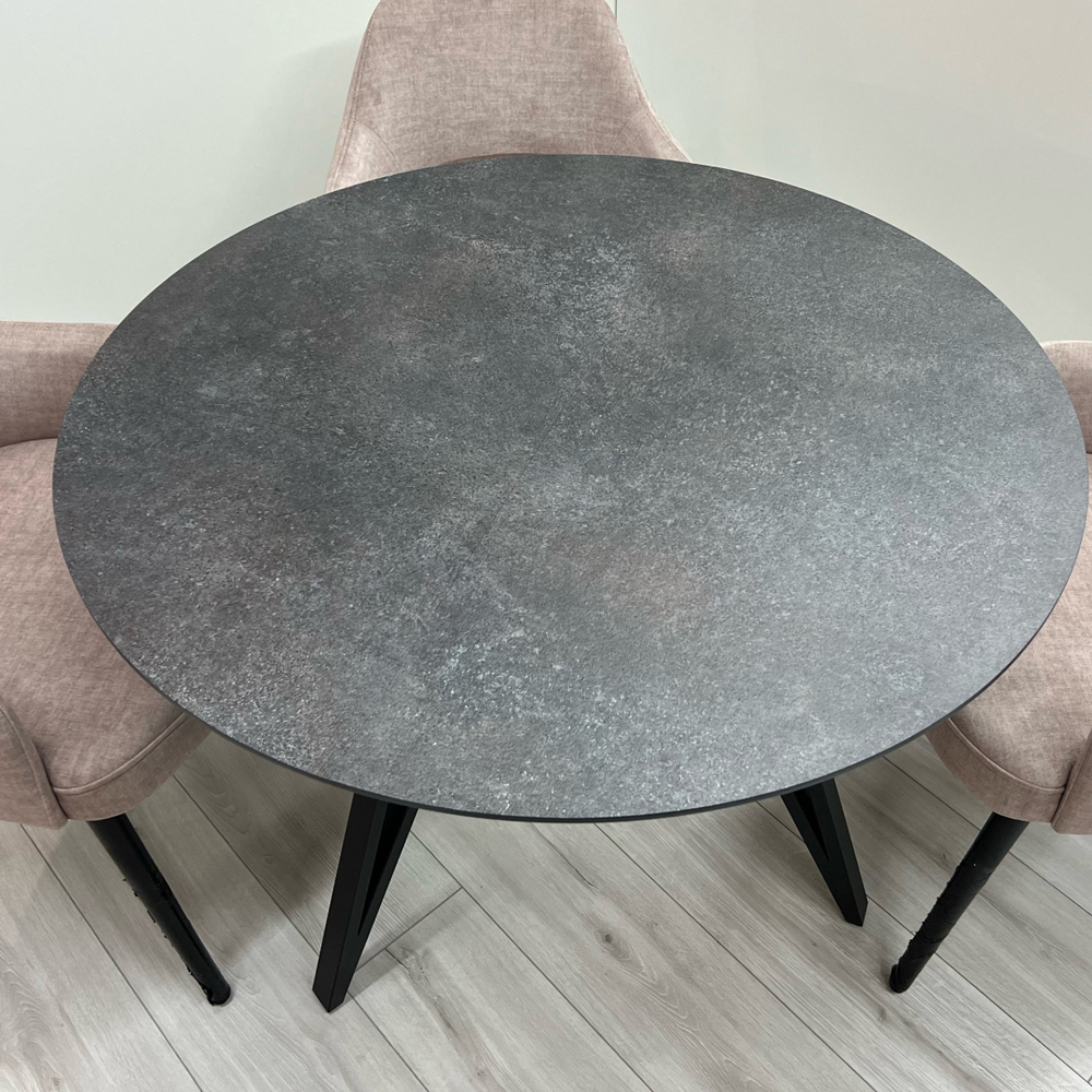 Обідній круглий стіл з HPL Три стріли Arrows (Граніт верчеллі антрацит) - чудовий вибір для тих, хто цінує стиль і довговічність у своєму будинку або офісі. HPL-стільниця зберігає свій первинний зовнішній вигляд і легко очищається від різних забруднень, зберігаючи свою міцність і насиченість кольору. Металеве підстілля надає столу додаткову міцність і стабільність. Цей круглий стіл успішно поєднує в собі сучасний дизайн і практичність. Він легко інтегрується в будь-яке приміщення і підходить для різних потреб - від домашнього використання до офісного. Міцність, надійність і зручність догляду роблять цей стіл ідеальним рішенням для тих, хто шукає стильний і функціональний обідній стіл для свого простору.