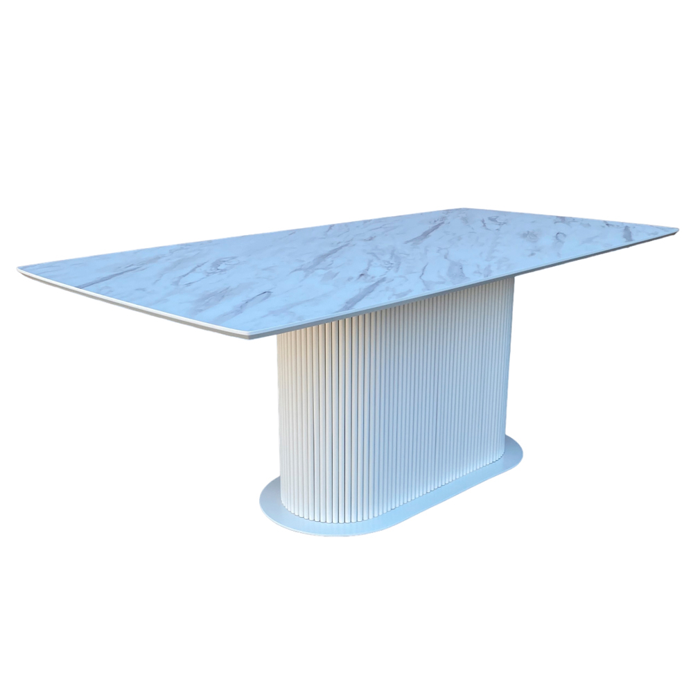 Обідній прямокутний стіл з HPL Овальна основа з нагелів на пластині (Мармур Леванто білий) є вишуканим виробом, який ідеально доповнить практично будь-який інтер'єр. Цей стіл підкреслить відмінне почуття стилю його власника, надаючи приміщенню додаткову елегантність. Він стане невід'ємним елементом у центрі вашого будинку, створюючи при цьому затишне місце для сімейних вечерь і зустрічей. Привабливістю цього столу є його овальне підстілля, яке не тільки надає вишуканості, а й додає функціональності цьому виробу меблів. Дайте собі насолодитися комфортом і стилем, перебуваючи за цим столом.