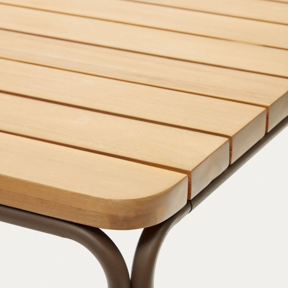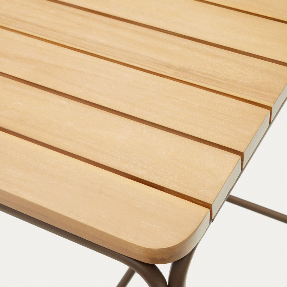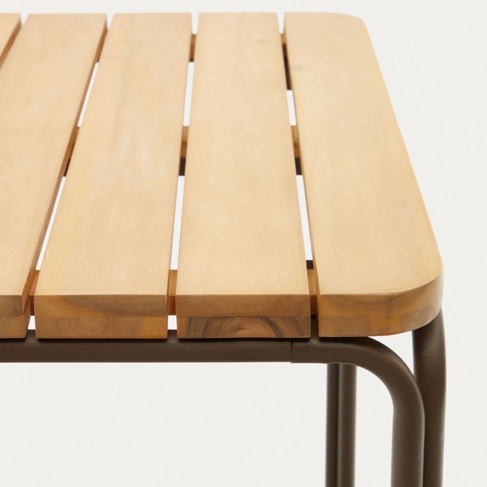 Стіл барний Salguer — це гармонійне поєднання природної естетики та промислової міцності. Стільниця з масиву акації, сертифікованої за FSC™, підкреслює індивідуальність кожного виробу, завдяки унікальній текстурі та відтінкам деревини. Водночас оцинкована сталева конструкція забезпечує надійність і стійкість до погодних умов та ультрафіолету.