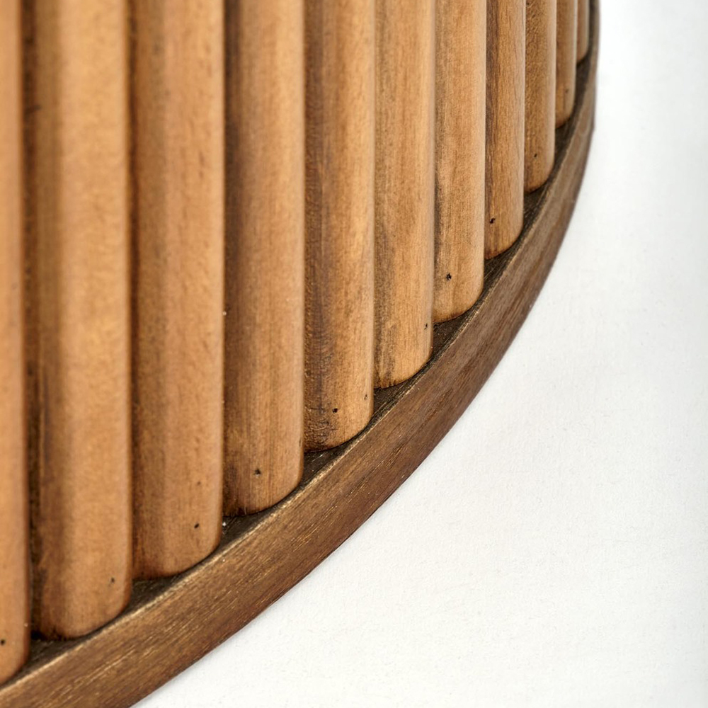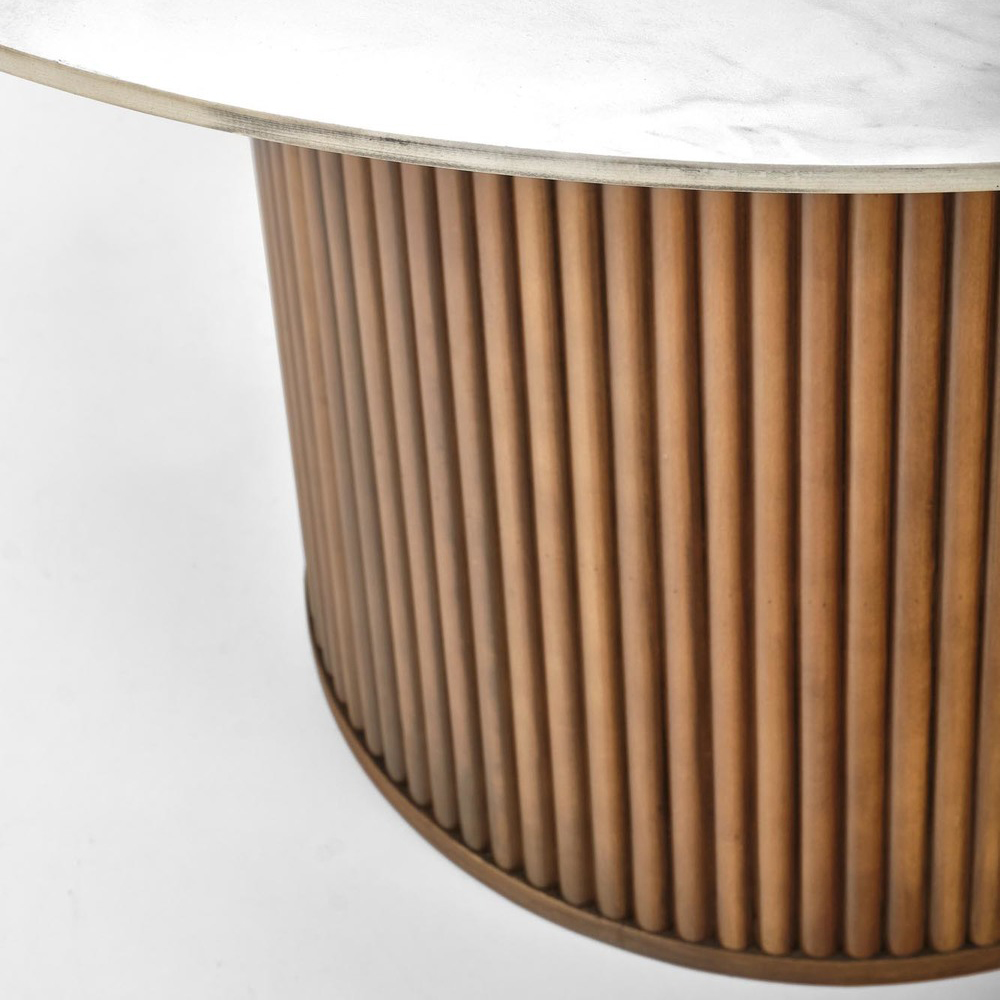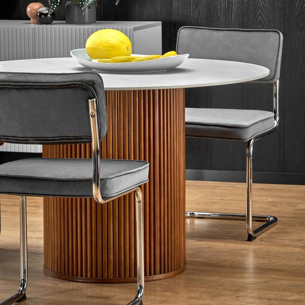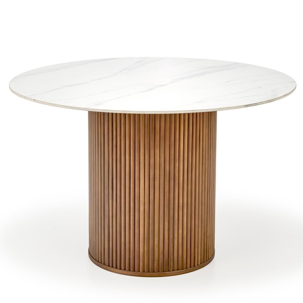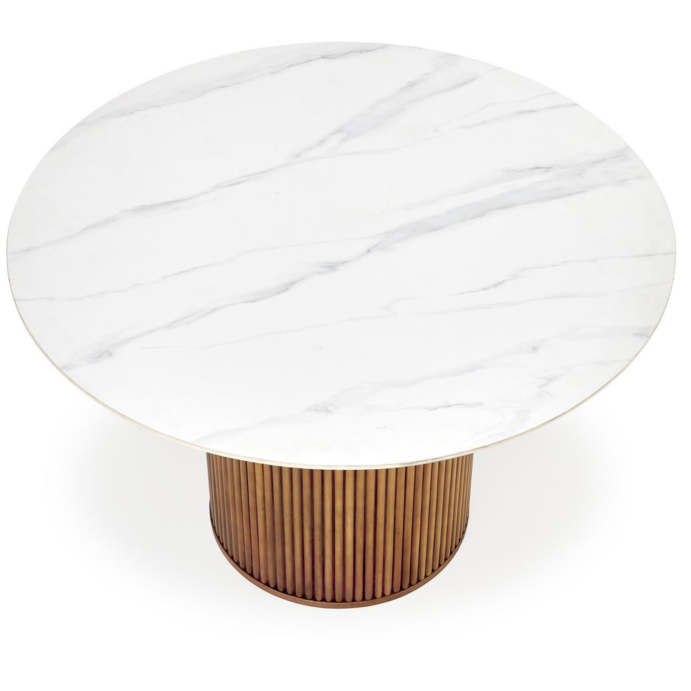 Стільниця виконана з кераміки, що забезпечує стійкість до подряпин, високих температур і легкість у догляді. Опора виготовлена з горіхового дерева, яке надає столу теплоти, елегантності та надійності.
