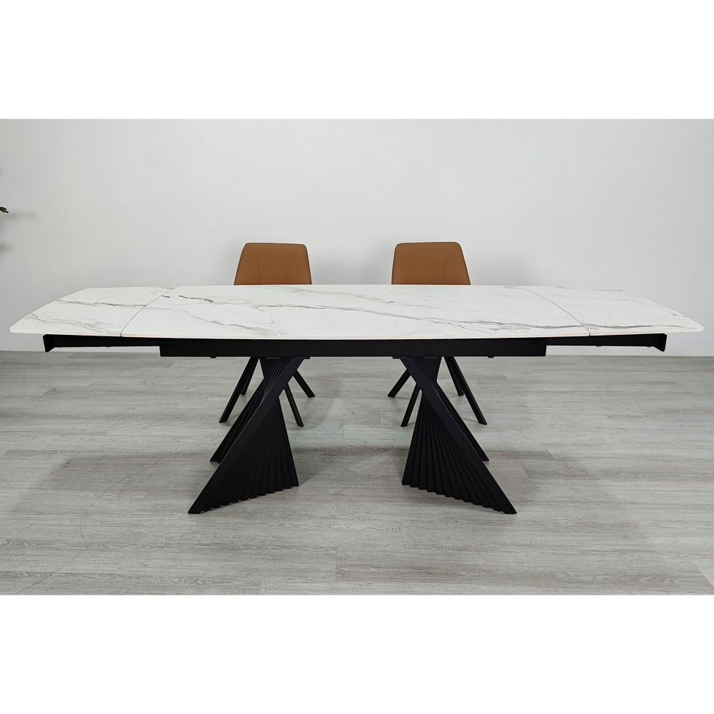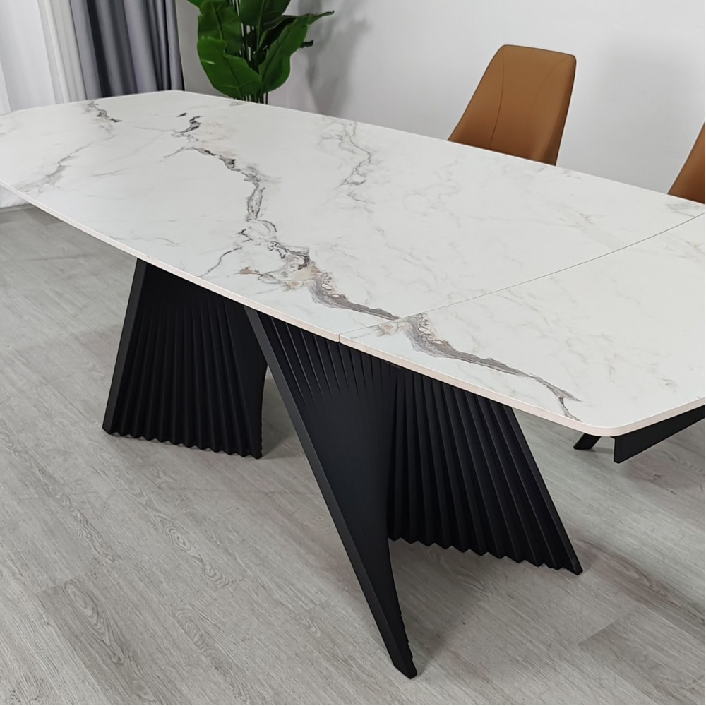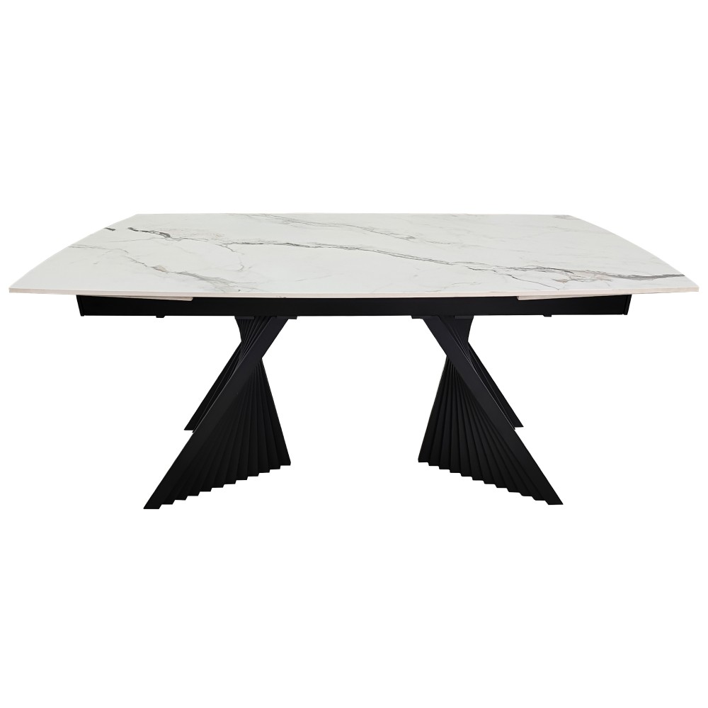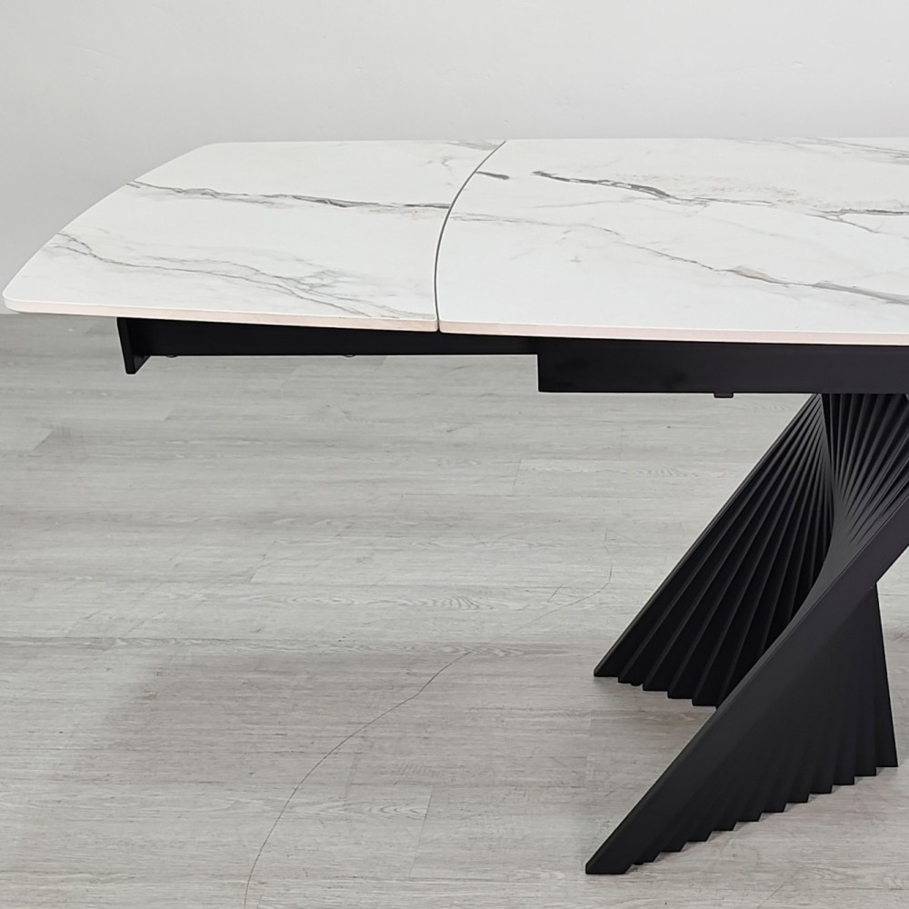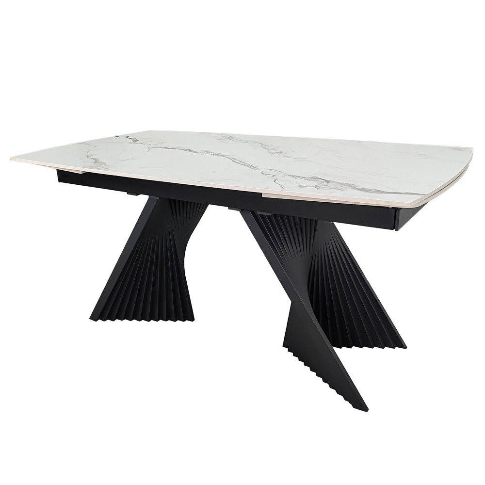 Стіл Edmund Ceramic вражає не лише функціональністю, а й архітектурною елегантністю. Унікальні геометричні опори з чорного металу створюють динамічну форму, що додає простору виразності та характеру. Водночас біла матова керамічна стільниця надає легкості та витонченості, створюючи гармонійний баланс між сучасним дизайном і практичністю.