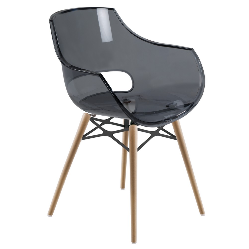 Стильне крісло Opal-Wox (Опал-Вокс) гармонійно впишеться в сучасну кухню або кафе, створюється тільки з довговічних матеріалів. Модель встановлена на чотирьох дерев'яних ніжках, які для додаткової міцності скріплені металевими перегородками. Цільне сидіння і спинка виконані з глянсового полікарбонату, з боків встановлені зручні підлокітники.